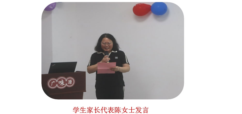 在這么一個有意義的日子里,我們邀請了三位學(xué)生的家長一同參與,并見證他們的高光時刻,讓他們感受到了畢業(yè)禮濃郁的氣氛,且有幸邀請到一位學(xué)生家長代表陳女士上臺為我們19位畢業(yè)生送上了最真摯的祝福和期望!