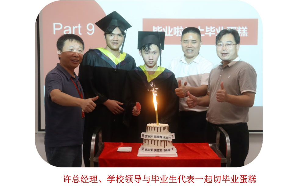 作為21級畢業(yè)生的主要導(dǎo)師-生產(chǎn)部張經(jīng)理對19位畢業(yè)生送上美好的祝賀和期許。校方領(lǐng)導(dǎo)盧校長講話時,充分肯定了廣味源的育人理念和宗旨,他認(rèn)為廣味源公司對實習(xí)學(xué)生的系統(tǒng)性教育為陽西中職學(xué)生未來的職業(yè)道路鋪上了最有支持力量的賽道,他對同學(xué)們實習(xí)期間的優(yōu)秀表現(xiàn)給予充分贊賞;對同學(xué)們即將踏入社會大教堂的關(guān)鍵節(jié)點(diǎn),提出要擁有強(qiáng)大內(nèi)心去迎接困難、保持自信能量活出非凡人生、深植愛國情懷始終向上而行。由衷地鼓勵同學(xué)們留在廣味源要好好干,安心干,干出成績,擁有大格局大作為鑄就大事業(yè),成為讓學(xué)校驕傲的學(xué)生。